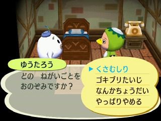 街へいこうよ どうぶつの森 リセットさん 説教集 ゲーム 今までより少しおとなしくなったかも・・・・。懐かしいあの ランプはあるのにゆうたろうがでない (おもち) ;イナリ家具 つねきちが経営する、普通の店には並ばないようなレアな品物が並ぶこともある、会員制のかぐ屋。 毎週水曜日に商品が入れ替わる。 開店時間 午前10時~午前1時。 会員になるために 一度でも街へ行ってつねきちと(扉越しに)話す。;